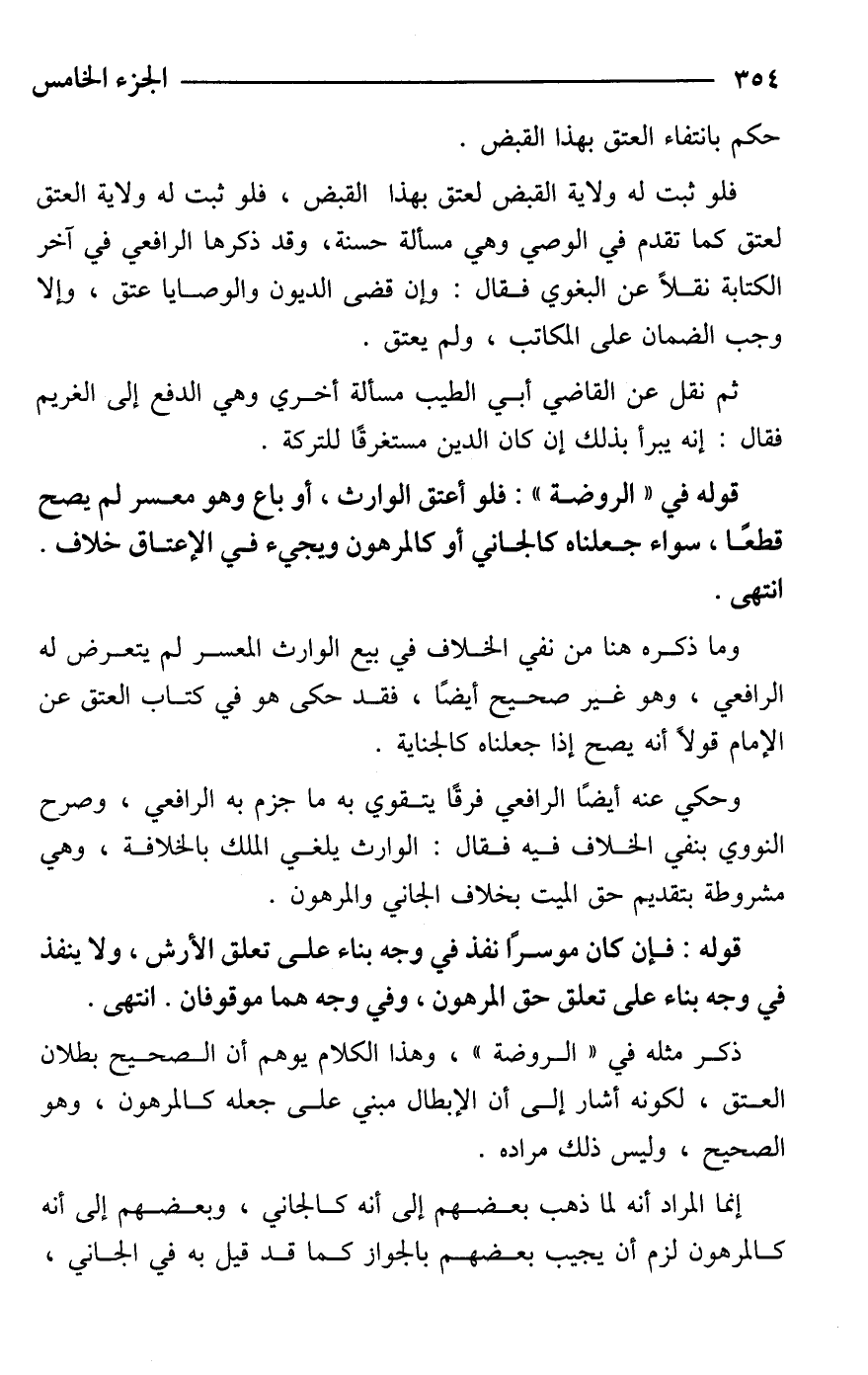 قوله في "الروضة": فلو أعتق الوارث، أو باع وهو معسر لم يصح قطعًا، سواء جعلناه كالجاني أو كالمرهون ويجيء في الإعتاق خلاف. انتهى.