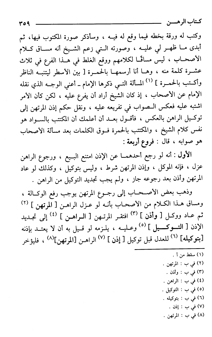 وكتب له ورقة بخطه فيما وقع له فيه، وسأذكر صورة المكتوب فيها، ثم أبدى ما ظهر لي عليه، وصورته التي زعم الشيخ أنه مساق كلام الأصحاب، ليس مساقًا لكلامهم ووقع الغلط في هذا الفرع في ثلاث عشرة كلمة منه، وها أنا أرسمها بالحمرة [بين الأسطر ليتنبه الناظر وأكتب بالحمرة] (¬1) المسألة التي ذكرها الإمام -أعني الوجه الذي نقله الإمام عن الأصحاب، إذ كان الشيخ أراد أن يفرع عليه، لكن كأن الأمر اشتبه عليه فعكس الصواب في تفريعه عليه، ونقل حكم إذن المرتهن إلى توكيل الراهن بالعكس، فأقول بعد أن أعلمك أن المكتتب بالسواد هو نفس كلام الشيخ، والمكتتب بالحمرة فوق الكلمات بعد مسألة الأصحاب هو صوابه، قال: فروع أربعة: