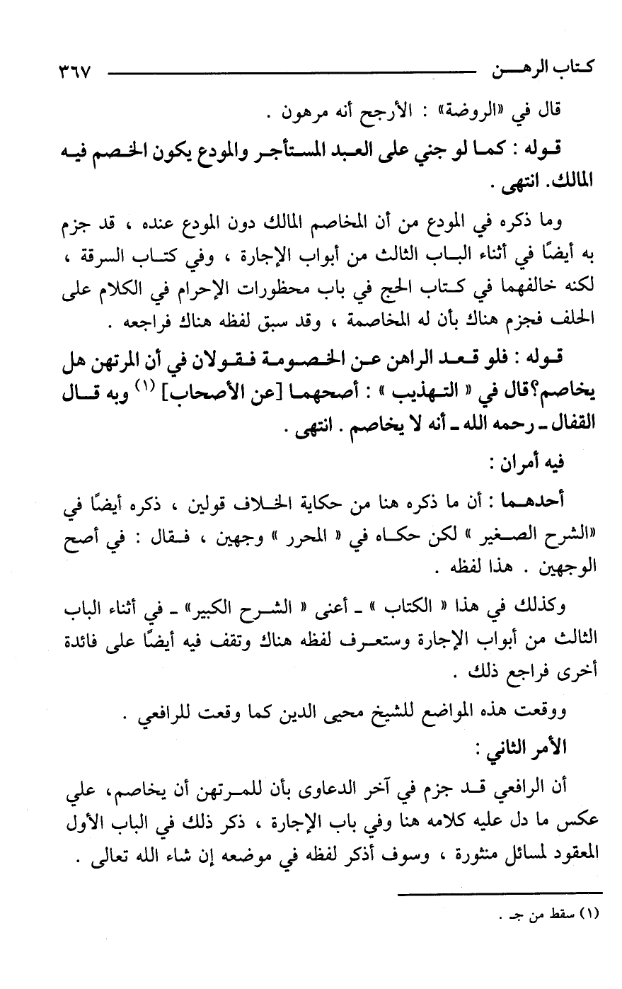 أن الرافعي قد جزم في آخر الدعاوى بأن للمرتهن أن يخاصم، علي عكس ما دل عليه كلامه هنا وفي باب الإجارة، ذكر ذلك في الباب الأول المعقود لمسائل منثورة، وسوف أذكر لفظه في موضعه إن شاء الله تعالى.