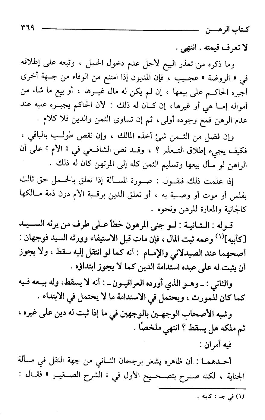 وما ذكره من تعذر البيع لأجل عدم دخول الحمل، وتبعه على إطلاقه في "الروضة" عجيب، فإن المديون إذا امتنع من الوفاء من جهة أخرى أجبره الحاكم على بيعها، إن لم يكن له مال غيرها، أو بيع ما شاء من أمواله إما هي أو غيرها، إن كان له ذلك: لأن الحاكم يجبره عليه عند عدم الرهن فمع وجوده أولى، ثم إن تساوى الثمن والدين فلا كلام.