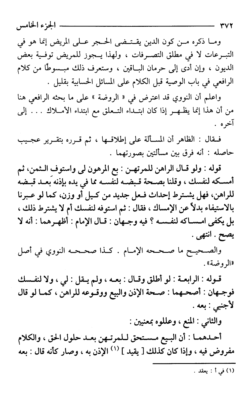 وما ذكره من كون الدين يقتضى الحجر على المريض إنما هو في التبرعات لا في مطلق التصرفات، ولهذا يجوز للمريض توفية بعض الديون، وإن أدى إلى حرمان الباقين، وستعرف ذلك مبسوطًا من كلام الرافعي في باب الوصية قبل الكلام على المسائل الحسابية بقليل.