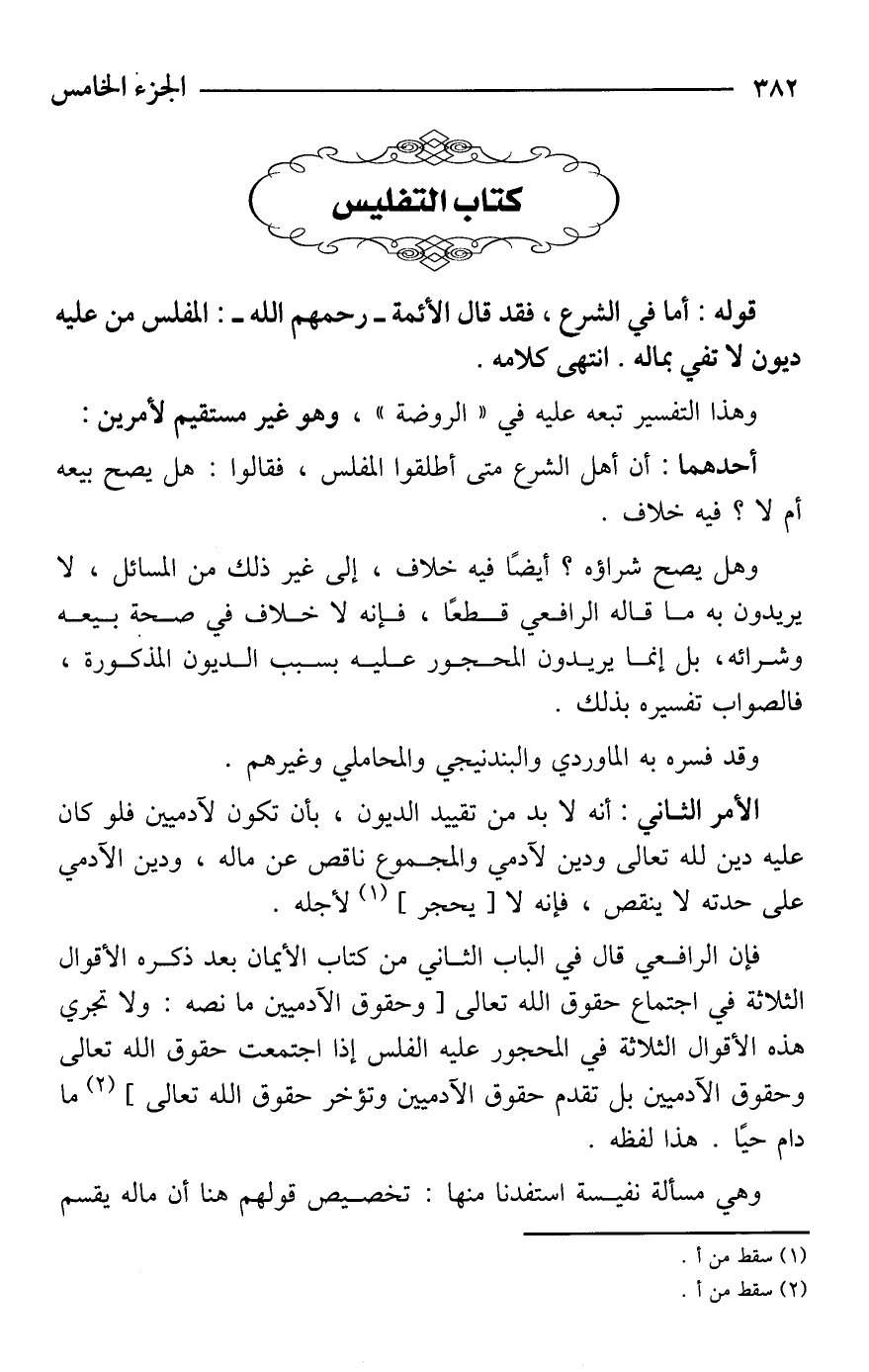 وهل يصح شراؤه؟ أيضًا فيه خلاف، إلى غير ذلك من المسائل، لا يريدون به ما قاله الرافعي قطعًا، فإنه لا خلاف في صحة بيعه وشرائه، بل إنما يريدون المحجور عليه بسبب الديون المذكورة، فالصواب تفسيره بذلك.