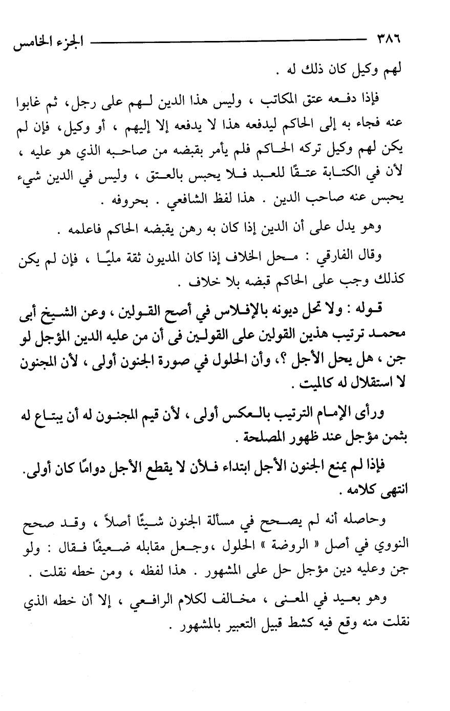 قوله: ولا تحل ديونه بالإفلاس في أصح القولين، وعن الشيخ أبى محمد ترتيب هذين القولين على القولين في أن من عليه الدين المؤجل لو جن، هل يحل الأجل؟ ، وأن الحلول في صورة الجنون أولى، لأن المجنون لا استقلال له كالميت.