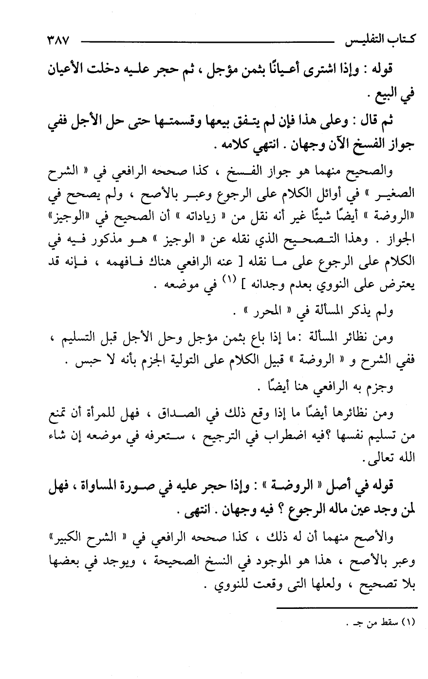 قوله في أصل "الروضة": وإذا حجر عليه في صورة المساواة، فهل لمن وجد عين ماله الرجوع؟ فيه وجهان. انتهى.