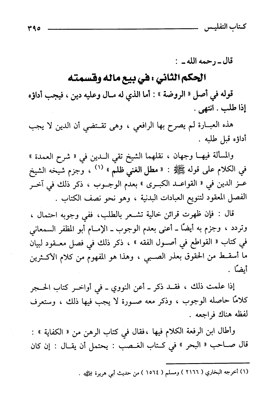 إذا علمت ذلك، فقد ذكر -أعني النووي- في أواخر كتاب الحجر كلامًا حاصله الوجوب، وذكر معه صورة لا يجب فيها ذلك، وستعرف لفظه هناك فراجعه.