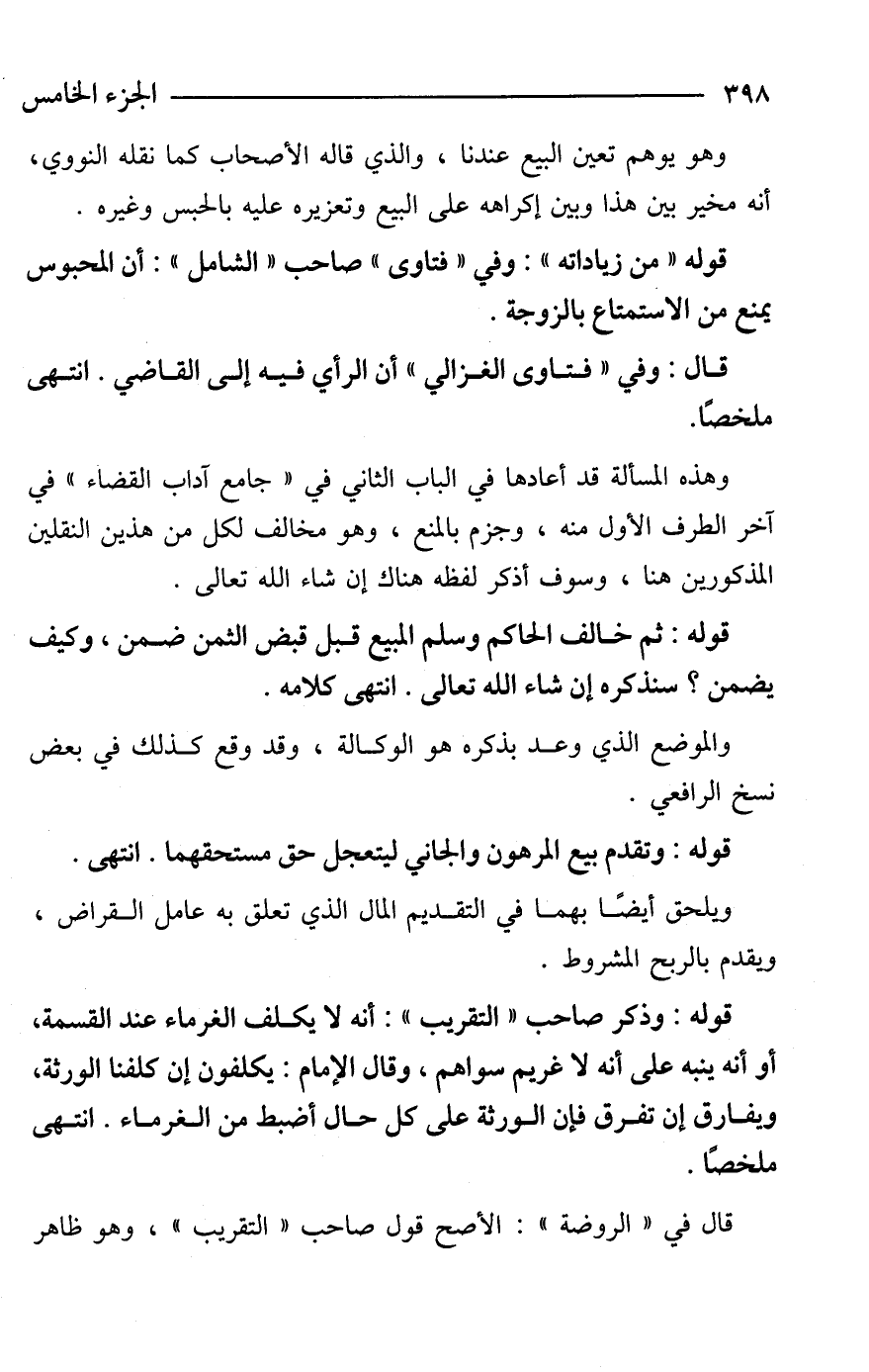 وهو يوهم تعين البيع عندنا، والذي قاله الأصحاب كما نقله النووي، أنه مخير بين هذا وبين إكراهه على البيع وتعزيره عليه بالحبس وغيره.