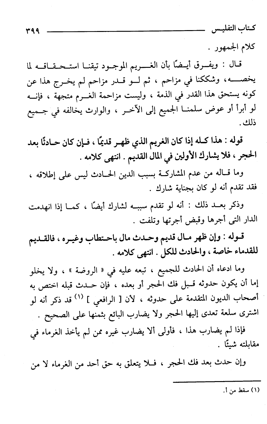 وما ادعاه أن الحادث للجميع، تبعه عليه في "الروضة"، ولا يخلو إما أن يكون حدوثه قبل فك الحجر أو بعده، فإن حدث قبله اختص به أصحاب الديون المتقدمة على حدوثه، لأن [الرافعي] (¬1) قد ذكر أنه لو اشترى سلعة تعدى إليها الحجر ولا يضارب البائع بثمنها على الصحيح.
