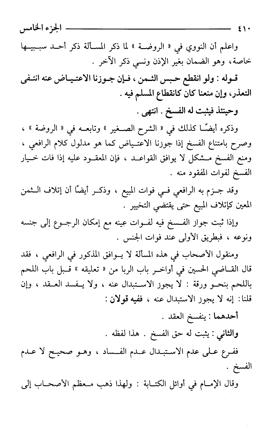 وذكره أيضًا كذلك في "الشرح الصغير" وتابعه في "الروضة"، وصرح بامتناع الفسخ إذا جوزنا الاعتياض كما هو مدلول كلام الرافعي، ومنع الفسخ مشكل لا يوافق القواعد، فإن المعقود عليه إذا فات خيار الفسخ لفوات المفقود منه.