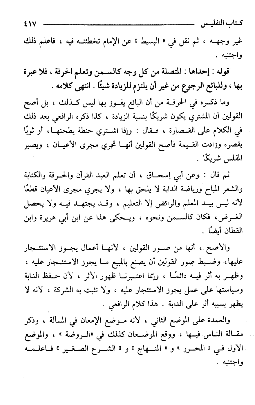 ثم قال: وعن أبي إسحاق، أن تعلم العبد القرآن والحرفة والكتابة والشعر المباح ورياضة الدابة لا يلحق بها، ولا يجري مجرى الأعيان قطعًا لأنه ليس بيد المعلم والرائض إلا التعليم، وقد يجتهد فيه ولا يحصل الغرض، فكان كالسمن ونحوه، ويحكى هذا عن ابن أبي هريرة وابن القطان أيضًا.
