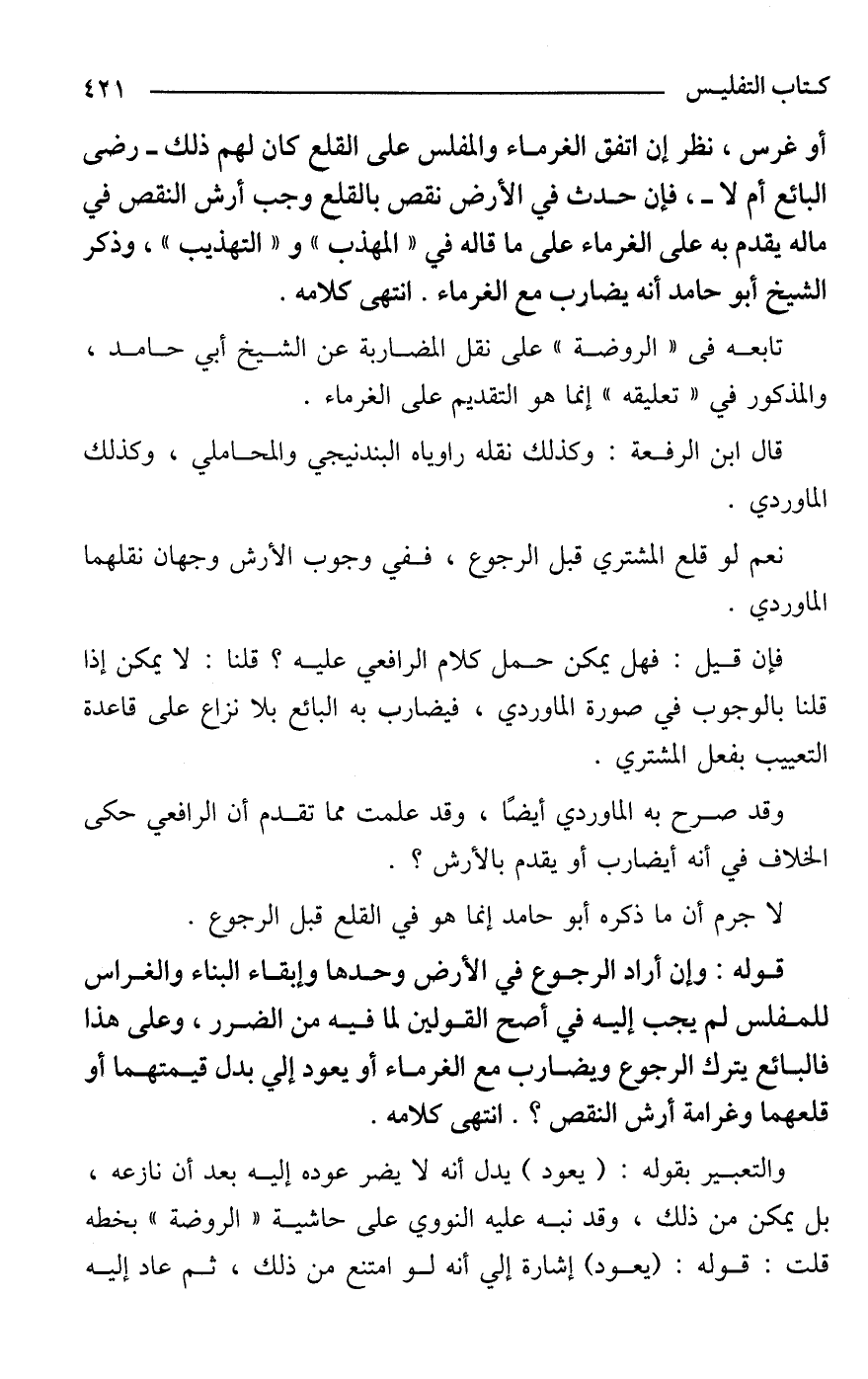 قوله: وإن أراد الرجوع في الأرض وحدها وإبقاء البناء والغراس للمفلس لم يجب إليه في أصح القولين لما فيه من الضرر، وعلى هذا فالبائع يترك الرجوع ويضارب مع الغرماء أو يعود إلي بدل قيمتهما أو قلعهما وغرامة أرش النقص؟ . انتهى كلامه.
