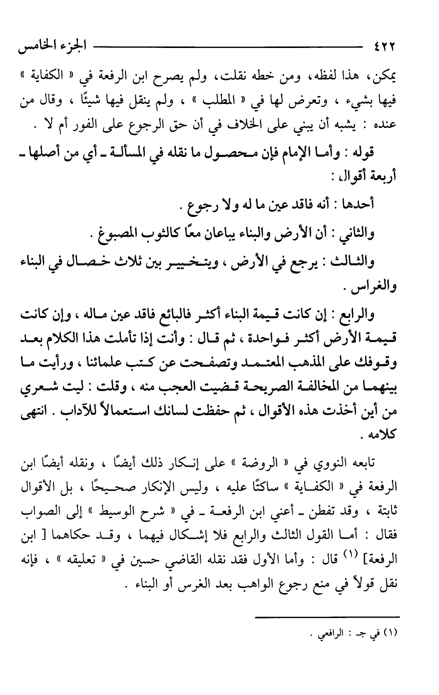 والرابع: إن كانت قيمة البناء أكثر فالبائع فاقد عين ماله، وإن كانت قيمة الأرض أكثر فواحدة، ثم قال: وأنت إذا تأملت هذا الكلام بعد وقوفك على المذهب المعتمد وتصفحت عن كتب علمائنا، ورأيت ما بينهما من المخالفة الصريحة قضيت العجب منه، وقلت: ليت شعري من أين أخذت هذه الأقوال، ثم حفظت لسانك استعمالًا للآداب. انتهى كلامه.