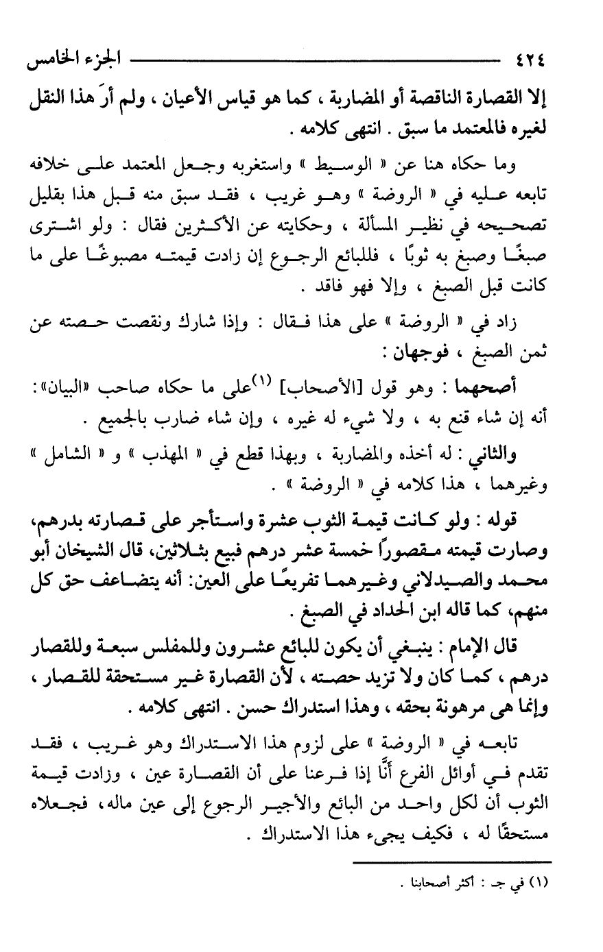 قال الإمام: ينبغي أن يكون للبائع عشرون وللمفلس سبعة وللقصار درهم، كما كان ولا تزيد حصته، لأن القصارة غير مستحقة للقصار، وإنما هى مرهونة بحقه، وهذا استدراك حسن. انتهى كلامه.
