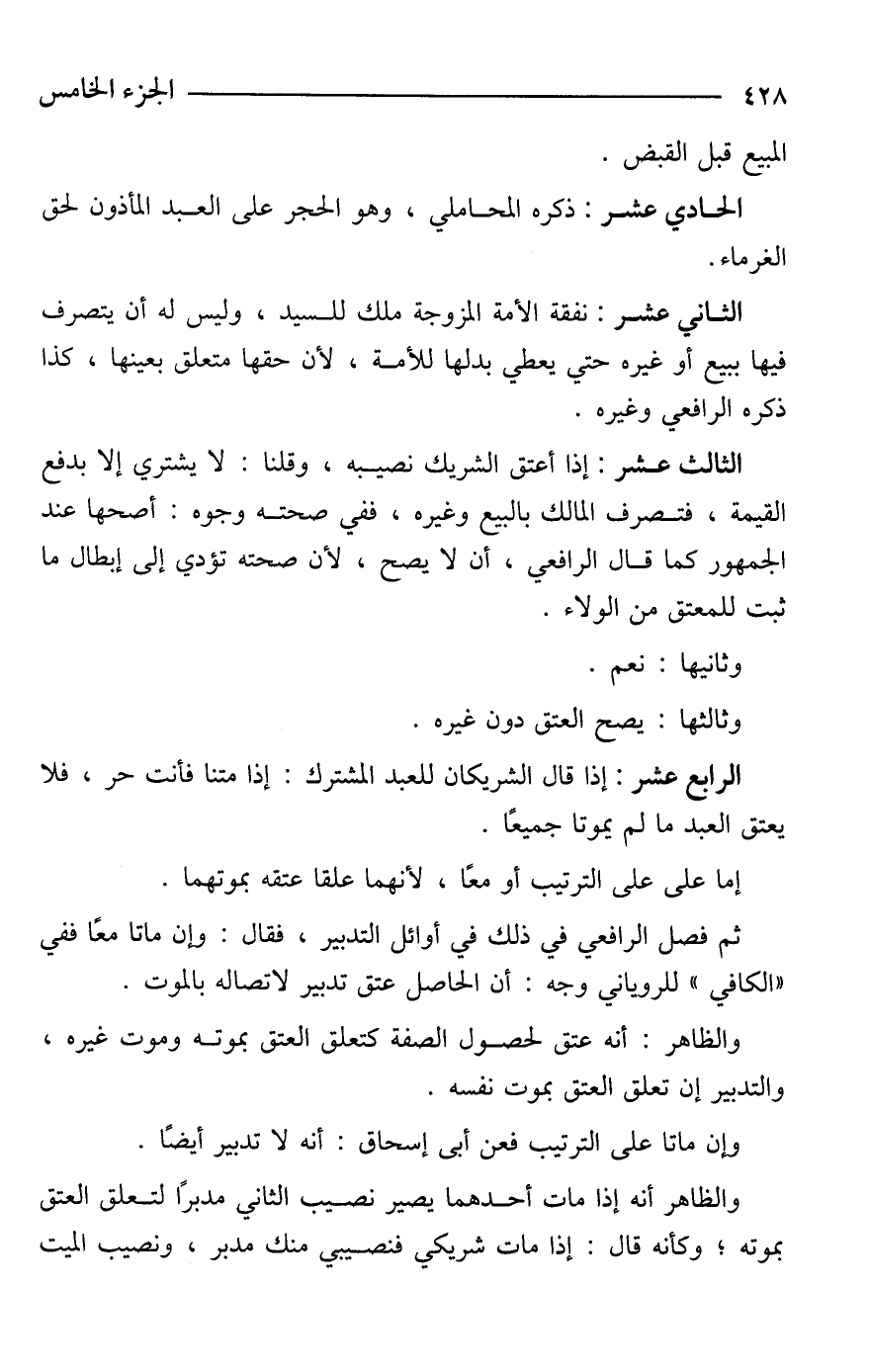 الثالث عشر: إذا أعتق الشريك نصيبه، وقلنا: لا يشتري إلا بدفع القيمة، فتصرف المالك بالبيع وغيره، ففي صحته وجوه: أصحها عند الجمهور كما قال الرافعي، أن لا يصح، لأن صحته تؤدي إلى إبطال ما ثبت للمعتق من الولاء.