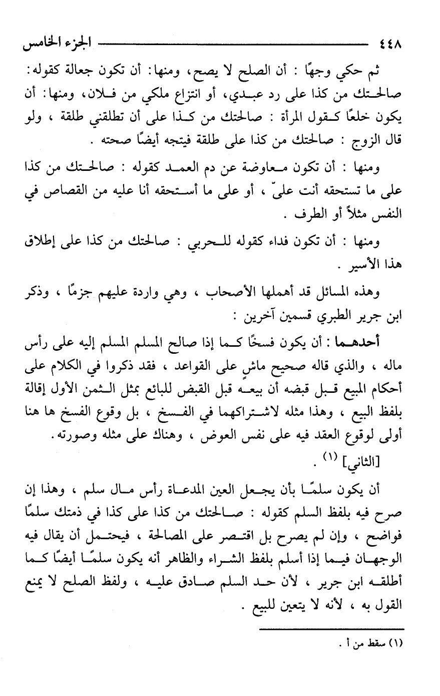 أحدهما: أن يكون فسخًا كما إذا صالح المسلم المسلم إليه على رأس ماله، والذي قاله صحيح ماشٍ على القواعد، فقد ذكروا في الكلام على أحكام المبيع قبل قبضه أن بيعه قبل القبض للبائع بمثل الثمن الأول وإقالة بلفظ البيع، وهذا مثله لاشتراكهما في الفسخ، بل وقوع الفسخ هاهنا أولى لوقوع العقد فيه على نفس العوض، وهناك على مثله وصورته. [الثاني] (¬1).