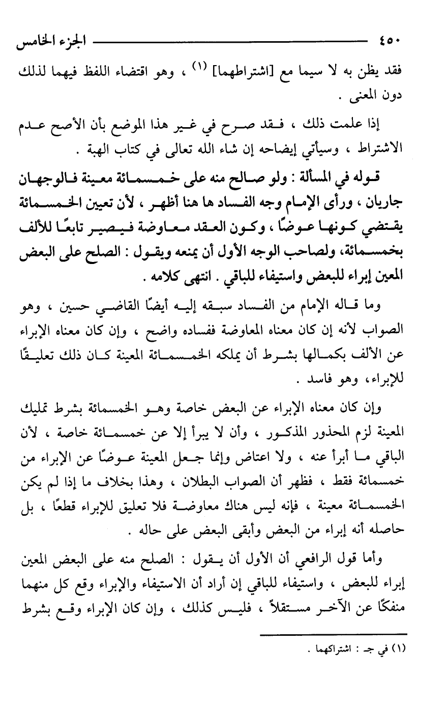 قوله في المسألة: ولو صالح منه على خمسمائة معينة فالوجهان جاريان، ورأى الإمام وجه الفساد هاهنا أظهر، لأن تعيين الخمسمائة يقتضي كونها عوضًا، وكون العقد معاوضة فيصير تابعًا للألف بخمسمائة، ولصاحب الوجه الأول أن يمنعه ويقول: الصلح على البعض المعين إبراء للبعض واستيفاء للباقي. انتهى كلامه.