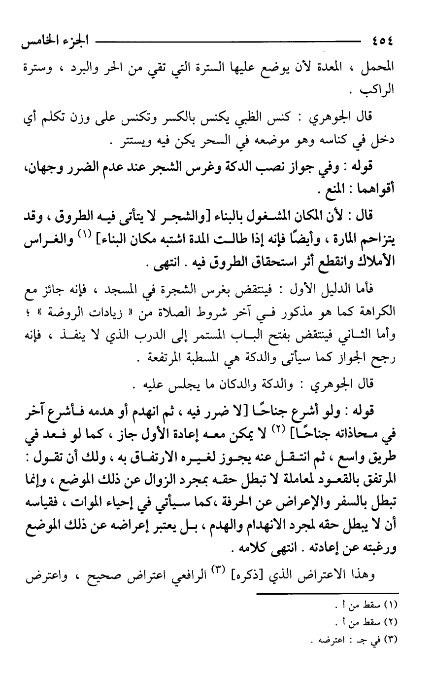 فأمّا الدّليل الأول: فينتقض بغرس الشجرة في المسجد، فإنه جائز مع الكراهة كما هو مذكور في آخر شروط الصلاة من "زيادات الروضة"؛ وأمّا الثاني فينتقض بفتح الباب المستمر إلى الدرب الذي لا ينفذ، فإنه رجح الجواز كما سيأتى والدكة هي المسطبة المرتفعة.
