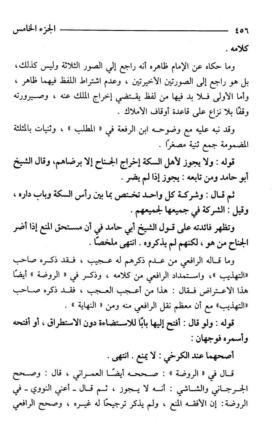 قوله: ولا يجوز لأهل السكة إخراج الجناح إلا برضاهم، وقال الشيخ أبو حامد ومن تابعه: يجوز إذا لم يضر.