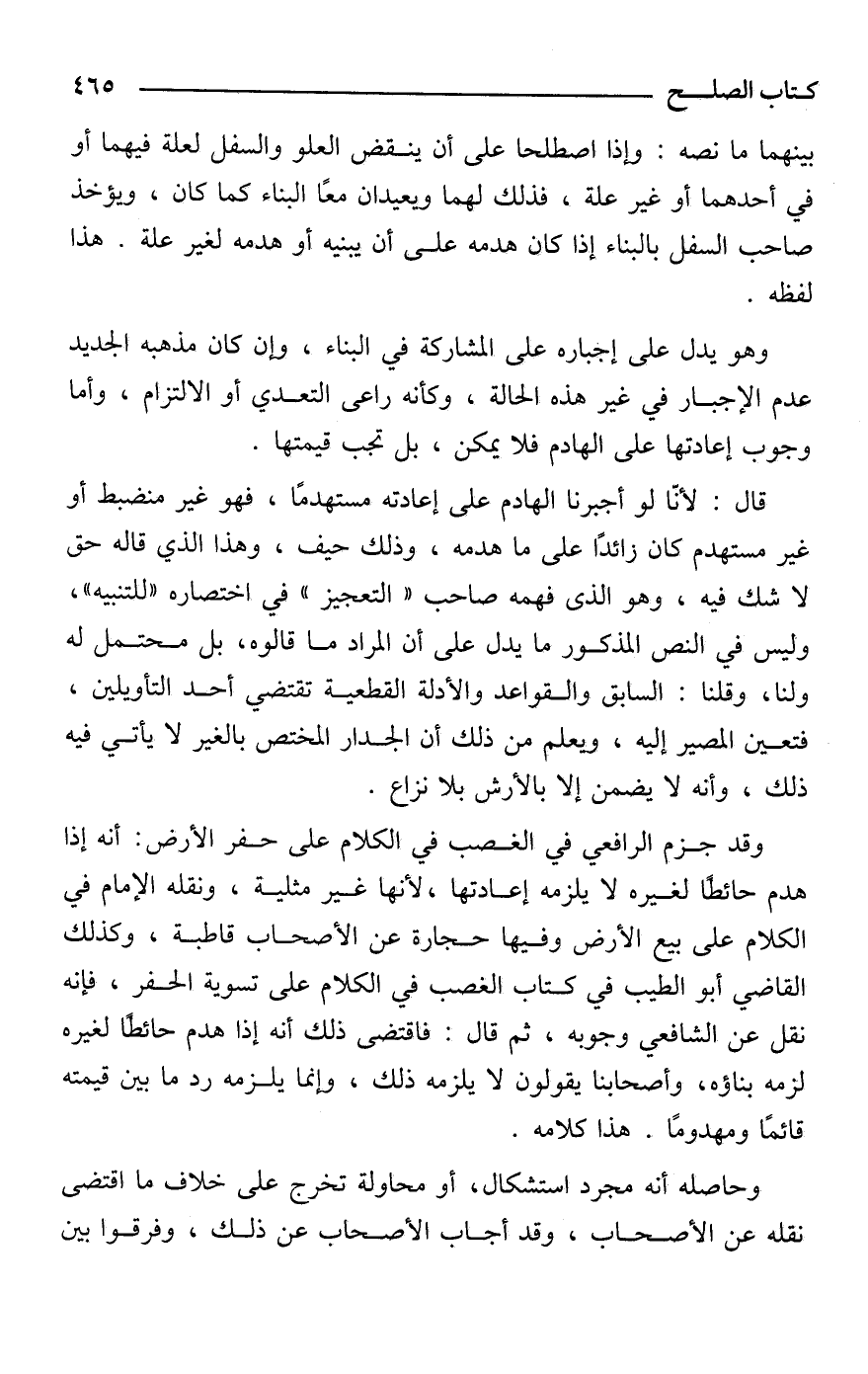 بينهما ما نصه: وإذا اصطلحا على أن ينقض العلّو والسفل لعلّة فيهما أو في أحدهما أو غير علة، فذلك لهما ويعيدان معًا البناء كما كان، ويؤخذ صاحب السفل بالبناء إذا كان هدمه على أن يبنيه أو هدمه لغير علة. هذا لفظه.