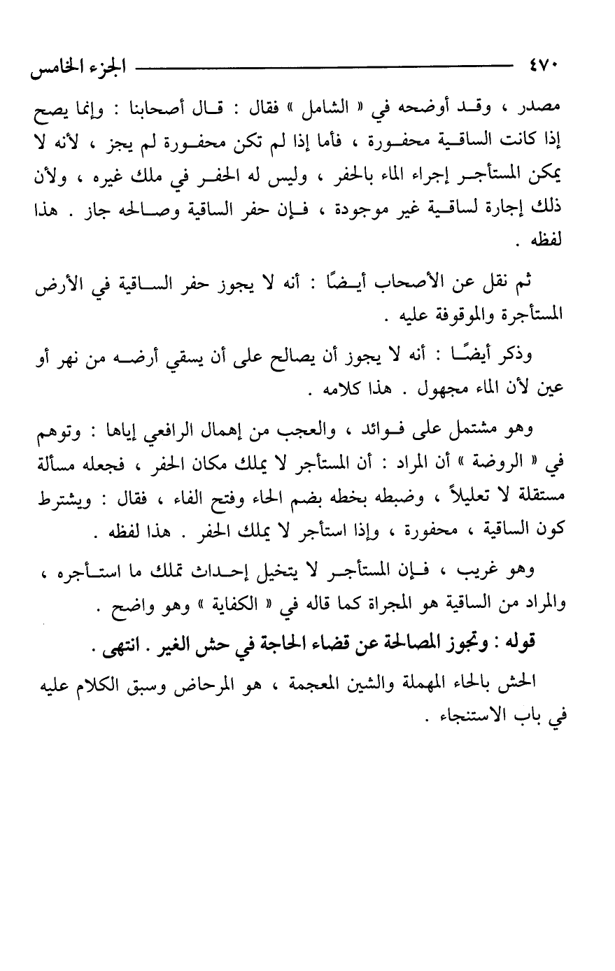 وهو مشتمل على فوائد، والعجب من إهمال الرافعي إياها: وتوهم في "الروضة" أن المراد: أن المستأجر لا يملك مكان الحفر، فجعله مسألة مستقلة لا تعليلًا، وضبطه بخطه بضم الحاء وفتح الفاء، فقال: ويشترط كون الساقية، محفورة، وإذا استأجر لا يملك الحفر. هذا لفظه.