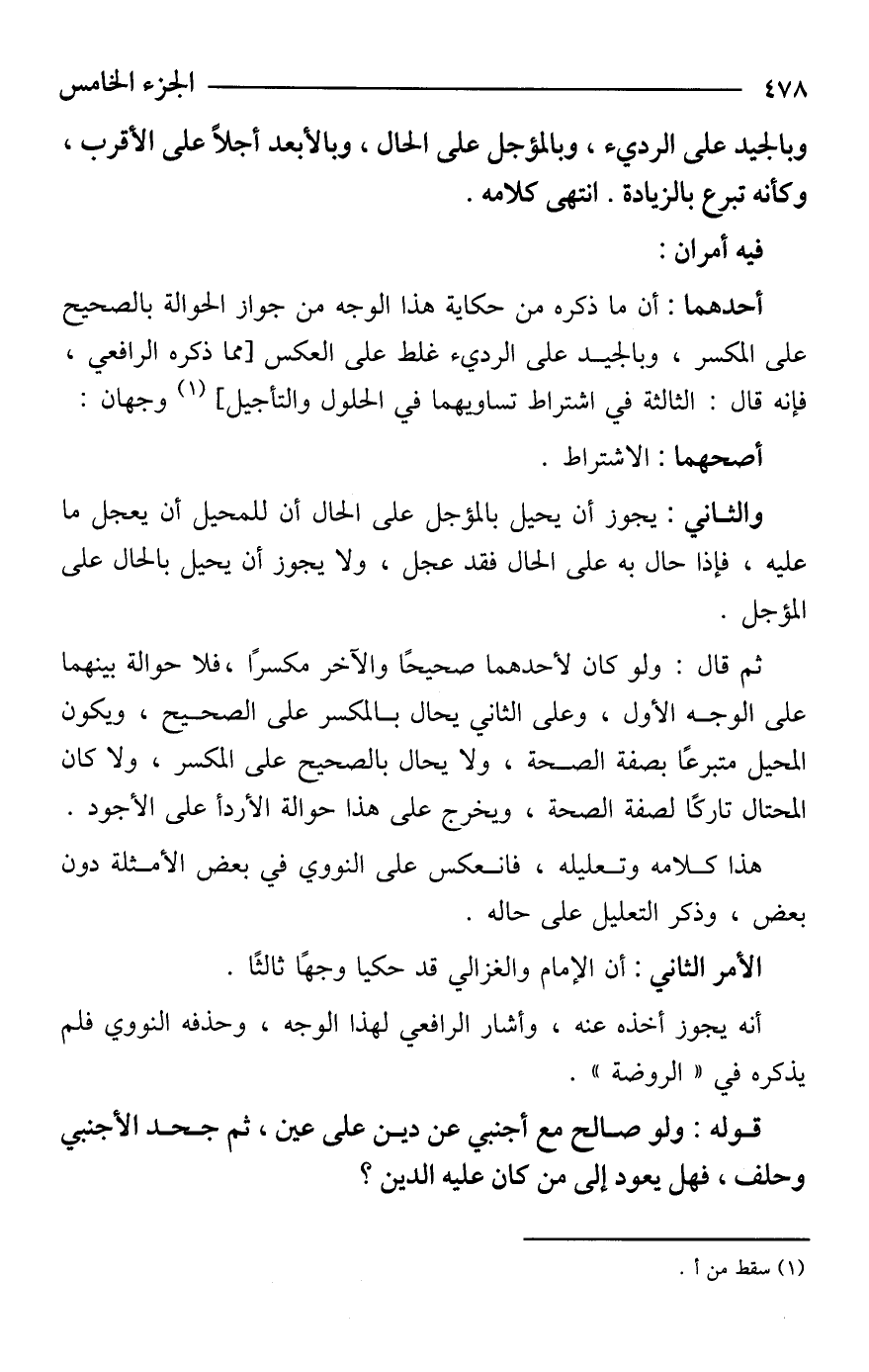 أحدهما: أن ما ذكره من حكاية هذا الوجه من جواز الحوالة بالصحيح على المكسر، وبالجيد على الرديء غلط على العكس [مما ذكره الرافعي، فإنه قال: الثالثة في اشتراط تساويهما في الحلول والتأجيل] (¬1) وجهان: