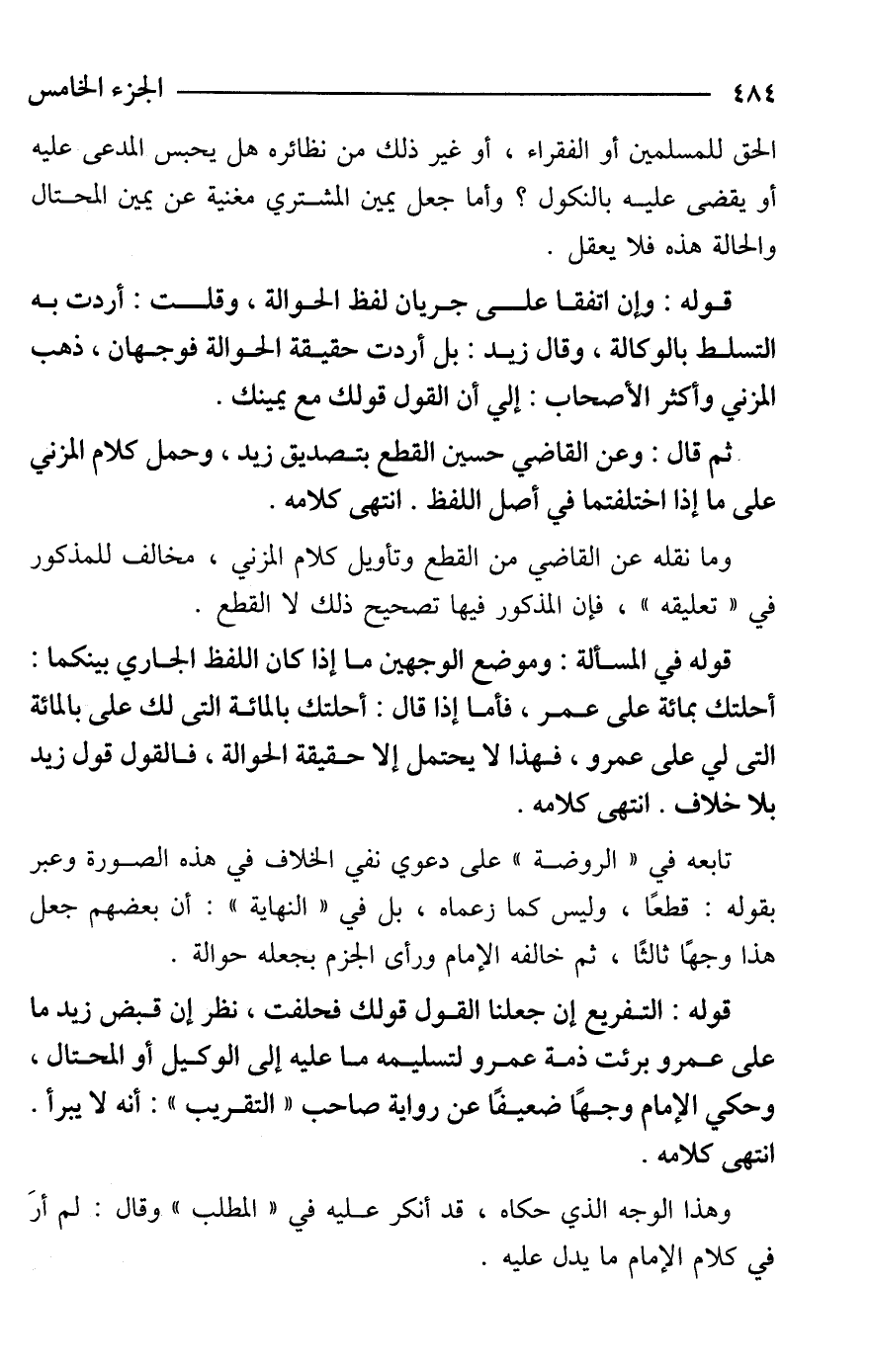 قوله في المسألة: وموضع الوجهين ما إذا كان اللفظ الجاري بينكما: أحلتك بمائة على عمر، فأمّا إذا قال: أحلتك بالمائة التى لك على بالمائة التى لي على عمرو، فهذا لا يحتمل إلا حقيقة الحوالة، فالقول قول زيد بلا خلاف. انتهى كلامه.