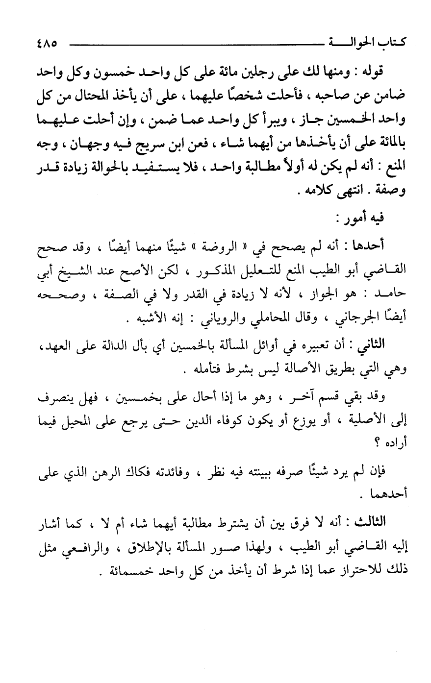 قوله: ومنها لك على رجلين مائة على كل واحد خمسون وكل واحد ضامن عن صاحبه، فأحلت شخصًا عليهما، على أن يأخذ المحتال من كل واحد الخمسين جاز، ويبرأ كل واحد عما ضمن، وإن أحلت عليهما بالمائة على أن يأخذها من أيهما شاء، فعن ابن سريج فيه وجهان، وجه المنع: أنه لم يكن له أولًا مطالبة واحد، فلا يستفيد بالحوالة زيادة قدر وصفة. انتهى كلامه.