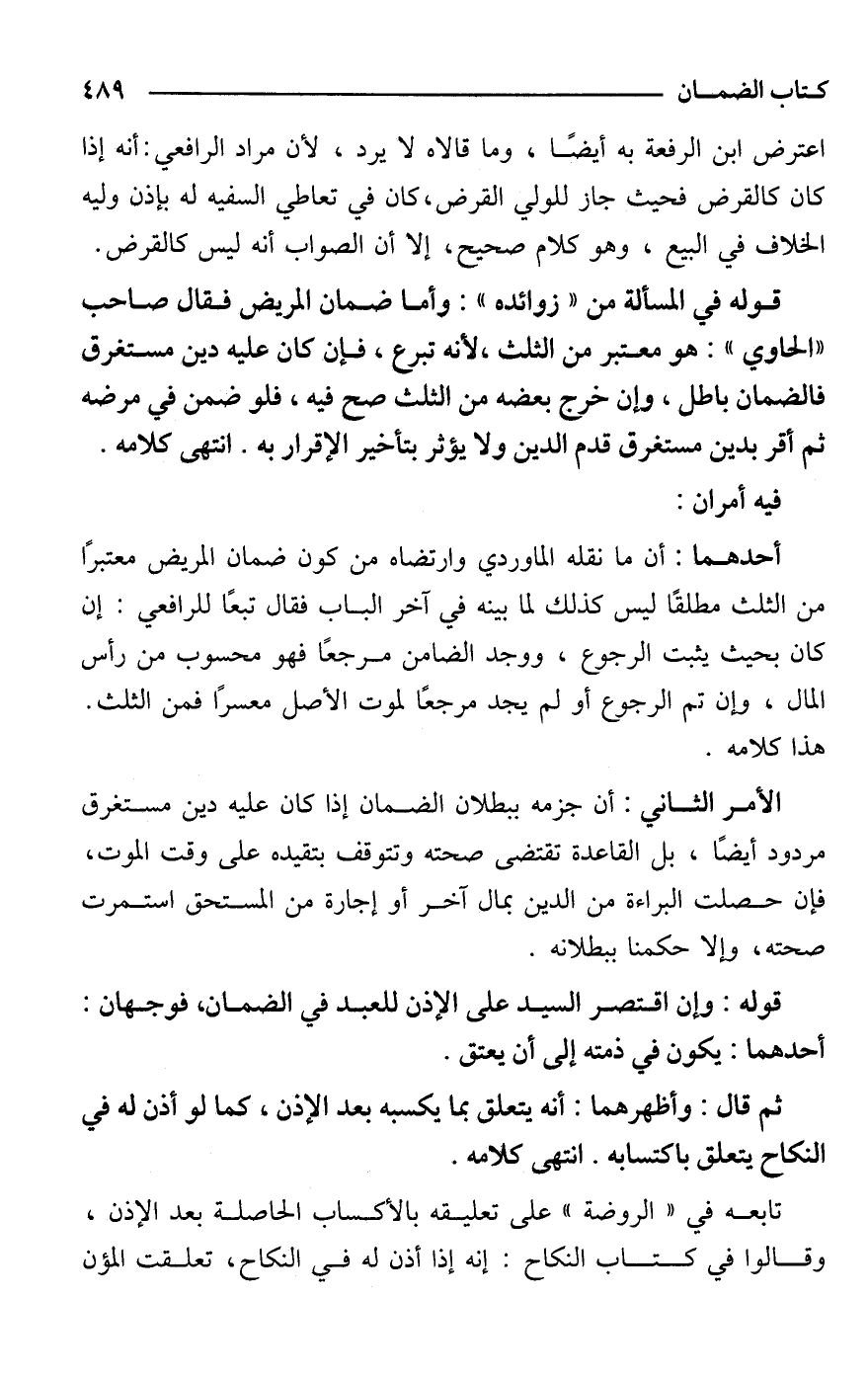أحدهما: أن ما نقله الماوردي وارتضاه من كون ضمان المريض معتبرًا من الثلث مطلقًا ليس كذلك لما بينه في آخر الباب فقال تبعًا للرافعي: إن كان بحيث يثبت الرجوع، ووجد الضامن مرجعًا فهو محسوب من رأس المال، وإن تم الرجوع أو لم يجد مرجعًا لموت الأصل معسرًا فمن الثلث. هذا كلامه.