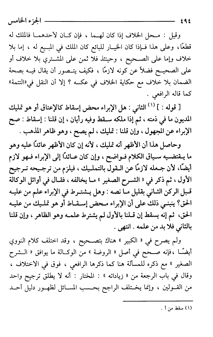 ولم يصرح في "الكبير" هناك بتصحيح، وقد اختلف كلام النووي أيضًا، فإنه صحح في أصل "الروضة" من الوكالة ما يوافق "الشرح الصغير" مع ذكره للمسألة هنا كما ذكرها الرافعي، فوق في الاختلاف، وقال في باب الرجعة من "زياداته": المختار: أنه لا يطلق ترجيح واحد من القولين، وإنما يختلف الراجح بحسب المسائل لظهور دليل أحد