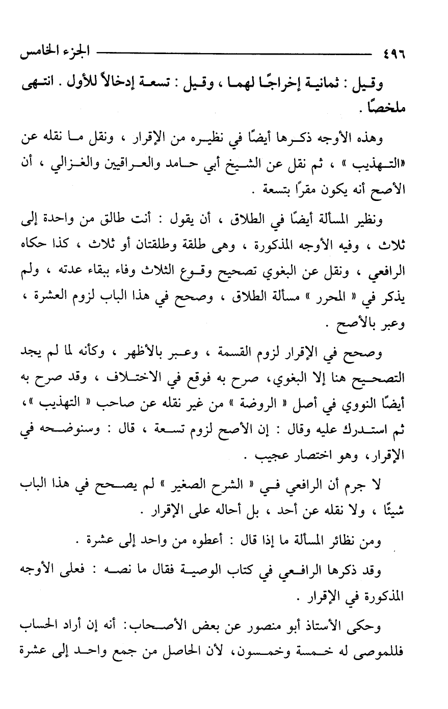 وهذه الأوجه ذكرها أيضًا في نظيره من الإقرار، ونقل ما نقله عن "التهذيب"، ثم نقل عن الشيخ أبي حامد والعراقيين والغزالي، أن الأصح أنه يكون مقرًا بتسعة.