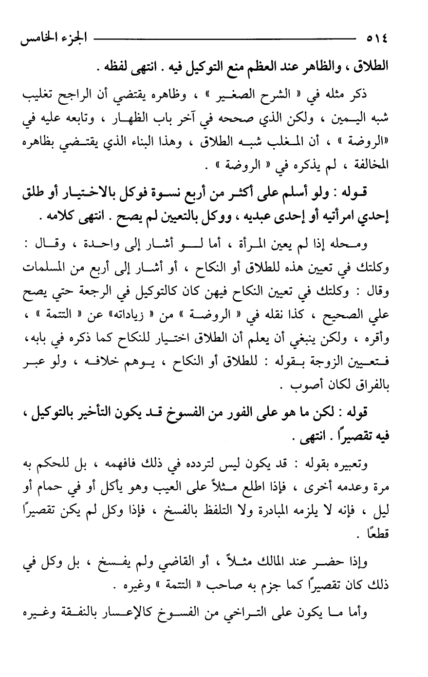 وتعبيره بقوله: قد يكون ليس لتردده في ذلك فافهمه، بل للحكم به مرّة وعدمه أخرى، فإذا اطلع مثلًا على العيب وهو يأكل أو في حمام أو ليل، فإنه لا يلزمه المبادرة ولا التلفظ بالفسخ، فإذا وكل لم يكن تقصيرًا قطعًا.