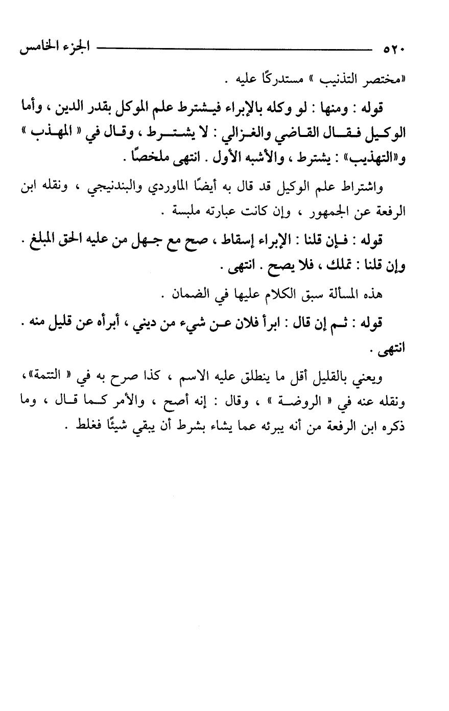 قوله: ومنها: لو وكله بالإبراء فيشترط علم الموكل بقدر الدين، وأما الوكيل فقال القاضي والغزالي: لا يشترط، وقال في "المهذب" و"التهذيب": يشترط، والأشبه الأول. انتهى ملخصًا.