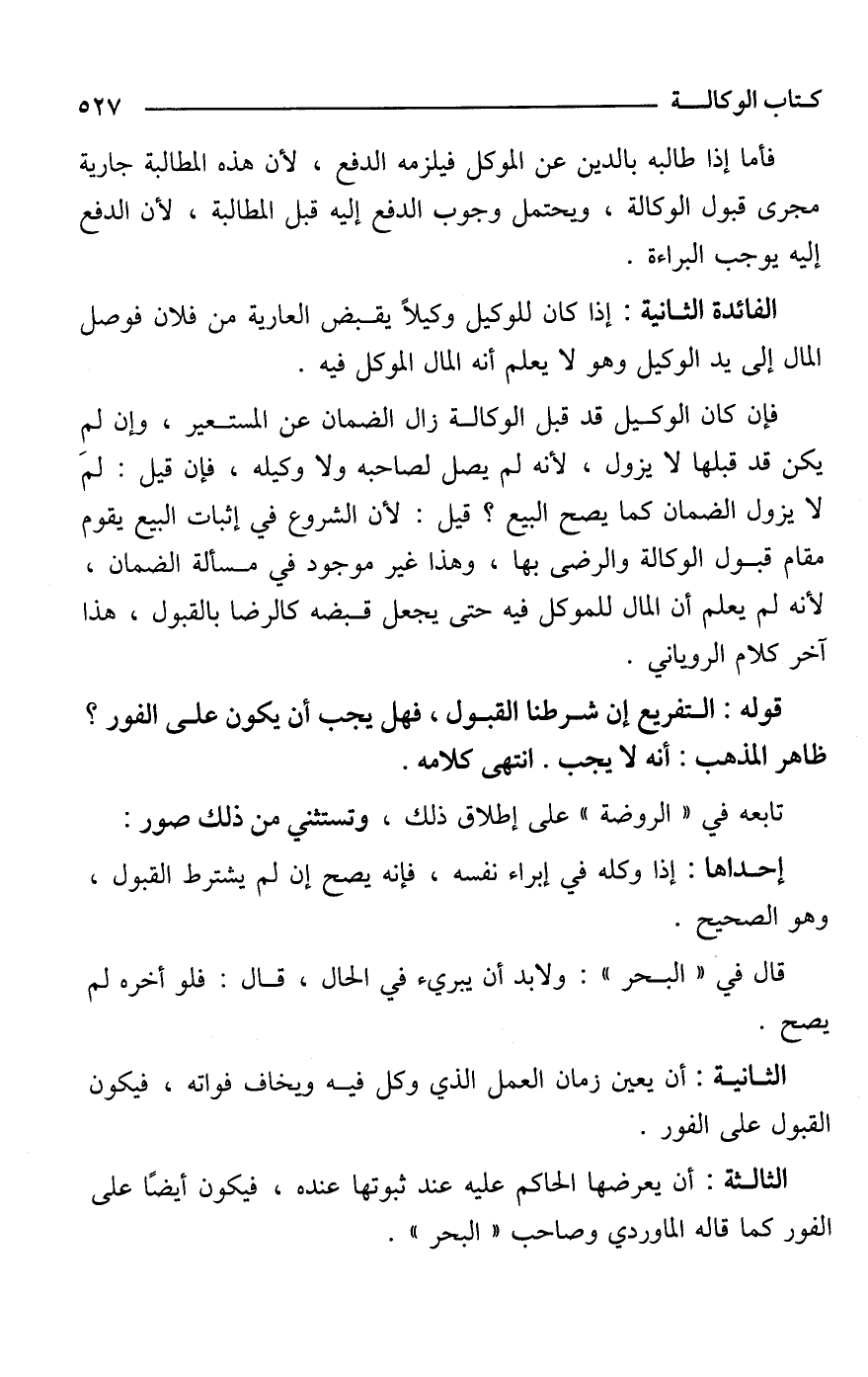 فإن كان الوكيل قد قبل الوكالة زال الضمان عن المستعير، وإن لم يكن قد قبلها لا يزول، لأنه لم يصل لصاحبه ولا وكيله، فإن قيل: لمَ لا يزول الضمان كما يصح البيع؟ قيل: لأن الشروع في إثبات البيع يقوم مقام قبول الوكالة والرضى بها، وهذا غير موجود في مسألة الضمان، لأنه لم يعلم أن المال للموكل فيه حتى يجعل قبضه كالرضا بالقبول، هذا آخر كلام الروياني.