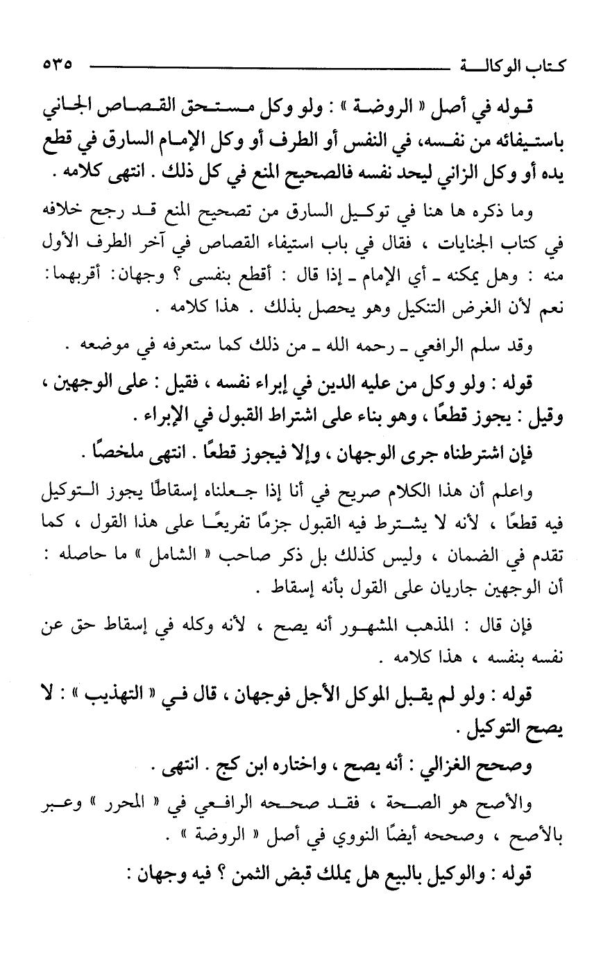 قوله في أصل "الروضة": ولو وكل مستحق القصاص الجاني باستيفائه من نفسه، في النفس أو الطرف أو وكل الإمام السارق في قطع يده أو وكل الزاني ليحد نفسه فالصحيح المنع في كل ذلك. انتهى كلامه.