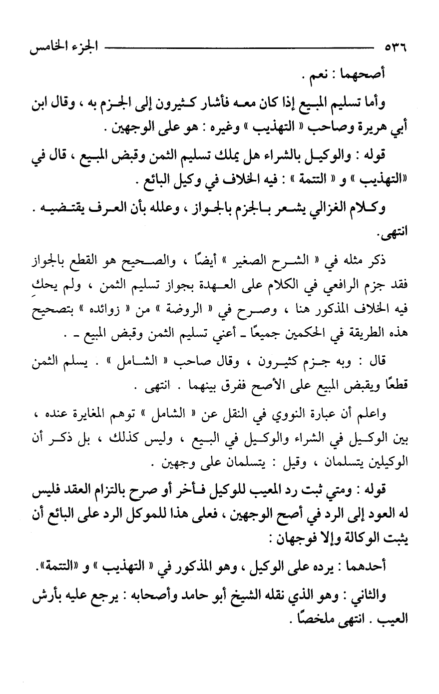 واعلم أن عبارة النووي في النقل عن "الشامل" توهم المغايرة عنده، بين الوكيل في الشراء والوكيل في البيع، وليس كذلك، بل ذكر أن الوكيلين يتسلمان، وقيل: يتسلمان على وجهين.