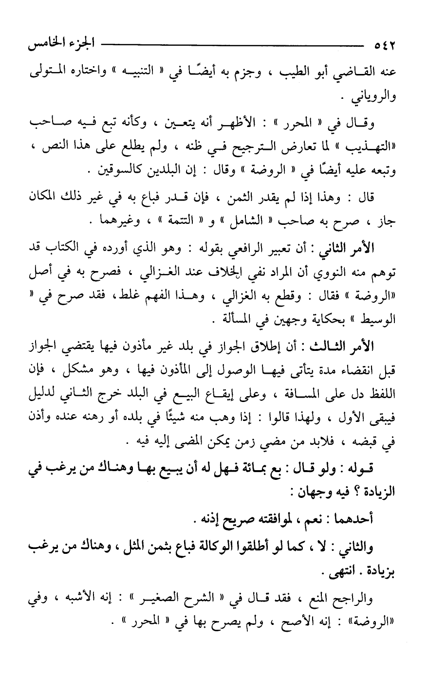 الأمر الثاني: أن تعبير الرافعي بقوله: وهو الذي أورده في الكتاب قد توهم منه النووي أن المراد نفي الخلاف عند الغزالي، فصرح به في أصل "الروضة" فقال: وقطع به الغزالي، وهذا الفهم غلط، فقد صرح في "الوسيط" بحكاية وجهين في المسألة.