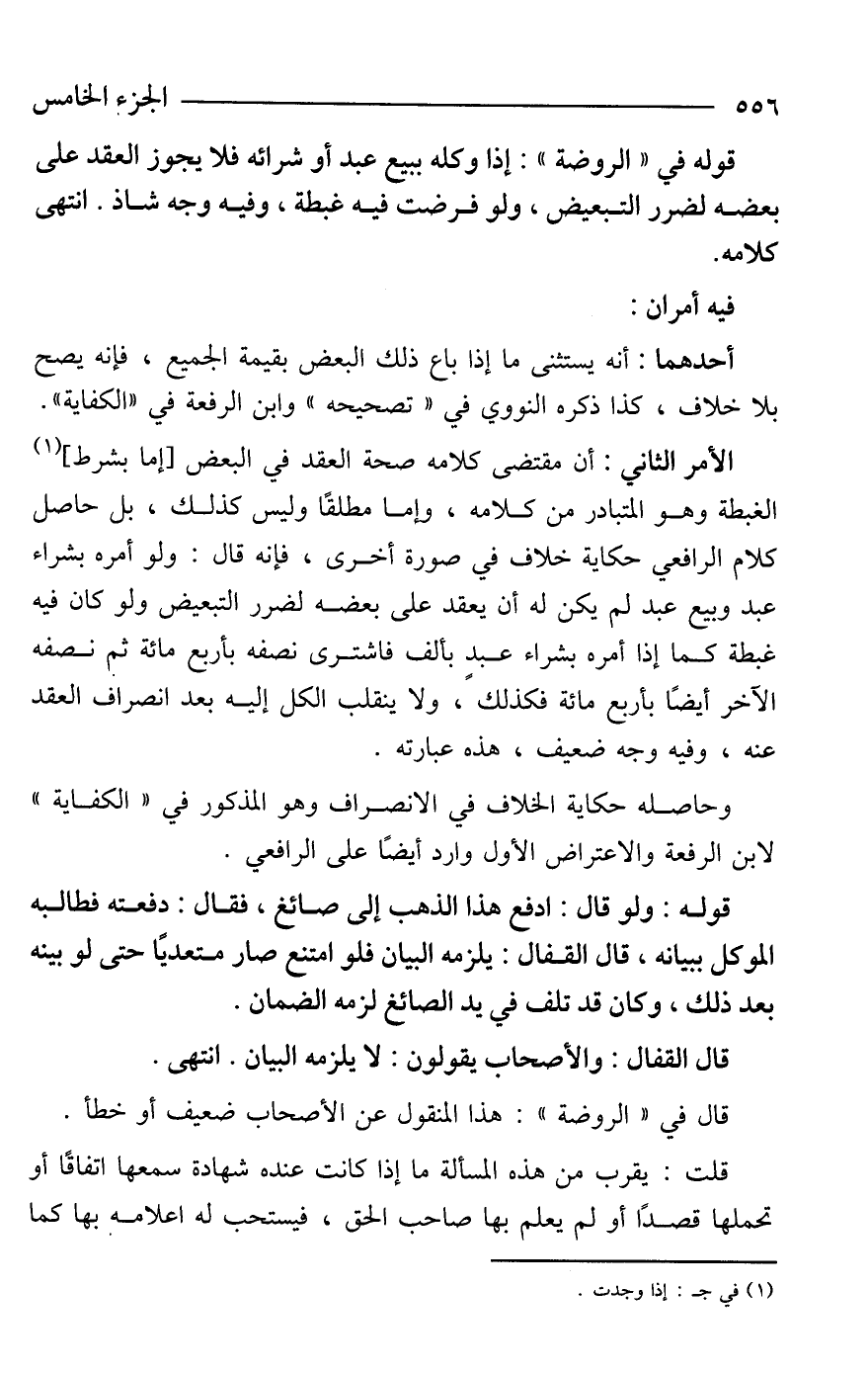 قوله في "الروضة": إذا وكله ببيع عبد أو شرائه فلا يجوز العقد على بعضه لضرر التبعيض، ولو فرضت فيه غبطة، وفيه وجه شاذ. انتهى كلامه.