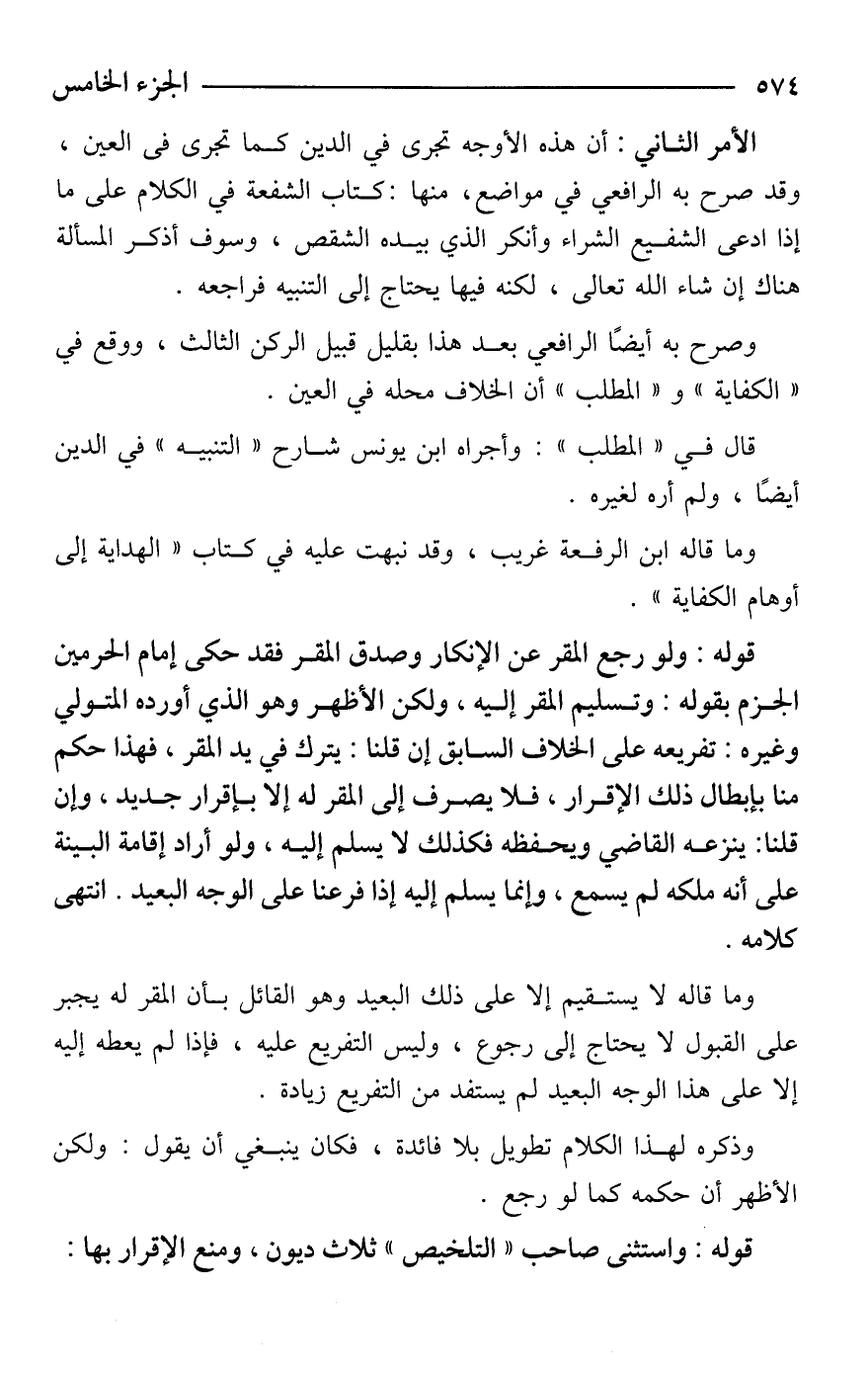 الأمر الثاني: أن هذه الأوجه تجرى في الدين كما تجرى في العين، وقد صرح به الرافعي في مواضع، منها: كتاب الشفعة في الكلام على ما إذا ادعى الشفيع الشراء وأنكر الذي بيده الشقص، وسوف أذكر المسألة هناك إن شاء الله تعالى، لكنه فيها يحتاج إلى التنبيه فراجعه.