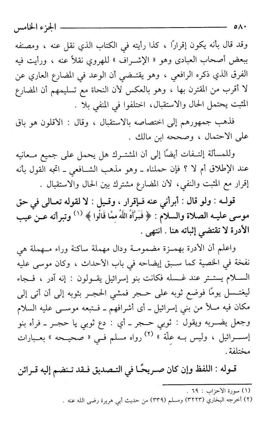 واعلم أن الأدرة بهمزة مضمومة ودال مهملة ساكنة وراء مهملة هي نفخة في الخصية كما سبق إيضاحه في باب الأحداث، وكان موسى -عليه السلام- يستتر عند غسله فكانت بنو إسرائيل يقولون: إنه آدر، فجاء ليغتسل يومًا فوضع ثوبه على حجر فمشي الحجر بثوبه إلى أن أتى إلى مكان فيه ملأ من بني إسرائيل -أى أشرافهم- فتبعه موسى -عليه السلام- وجعل يضربه ويقول: ثوبي حجر -أي: دع ثوبي يا حجر- فرأه بنو إسرائيل، وليس به عِلّة" (¬2) رواه مسلم في "صحيحه" بعبارات مختلفة.
