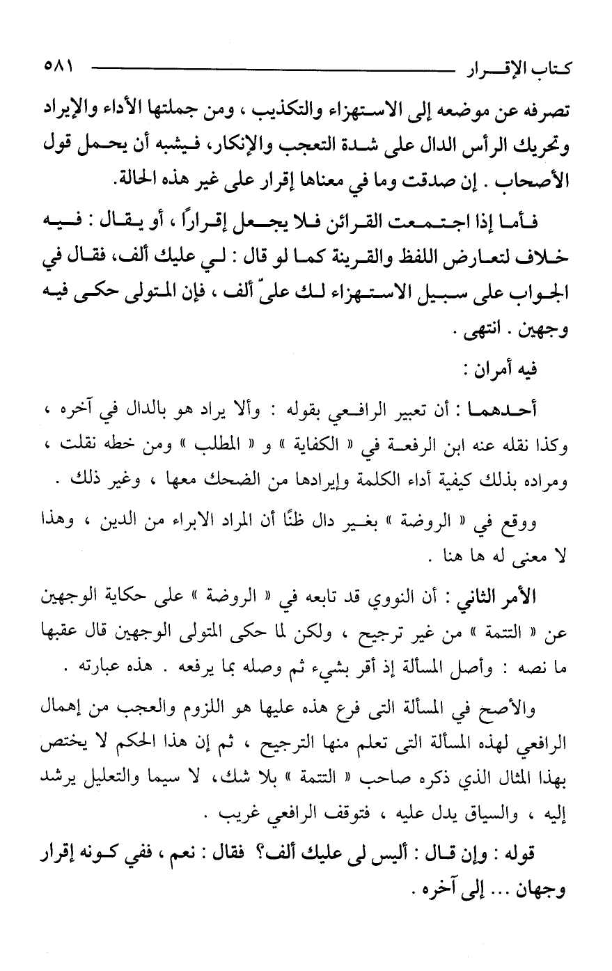 فأما إذا اجتمعت القرائن فلا يجعل إقرارًا، أو يقال: فيه خلاف لتعارض اللفظ والقرينة كما لو قال: لي عليك ألف، فقال في الجواب على سبيل الاستهزاء لك علىّ ألف، فإن المتولى حكى فيه وجهين. انتهى.