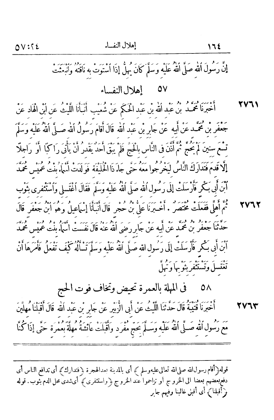 [2761] أَقَامَ رَسُول الله صلى الله تَعَالَى عَلَيْهِ وَسلم أَي بِالْمَدِينَةِ بعد الْهِجْرَة فتدارك أَي تدافع النَّاس أَي دفع بَعضهم بَعْضًا إِلَى الْخُرُوج أَو تزاحموا عِنْد الْخُرُوج واستثفرى أَي شدى مَحل الدَّم بِثَوْب قَوْله أَقبلنَا أَي أقبل غالبنا وَفِيهِمْ جَابر
