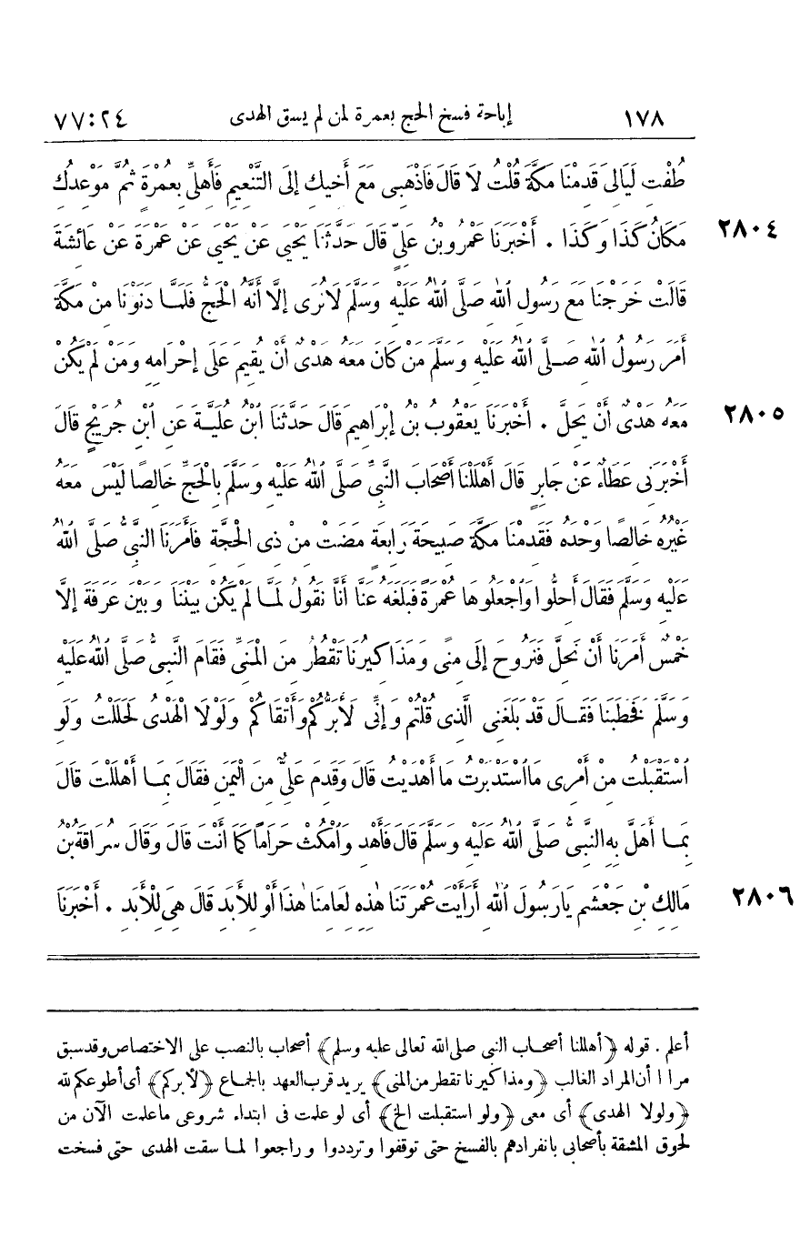 [2805] أَهْلَلْنَا أَصْحَاب النَّبِي صلى الله تَعَالَى عَلَيْهِ وَسلم أَصْحَاب بِالنّصب على الِاخْتِصَاص وَقد سبق مرَارًا أَن المُرَاد الْغَالِب ومذاكيرنا تقطر من الْمَنِيّ يُرِيد قرب الْعَهْد بِالْجِمَاعِ لأبركم أَي أطوعكم لله وَلَوْلَا الْهدى أَي معي وَلَو اسْتقْبلت الخ أَي لَو علمت فِي ابْتِدَاء شروعي مَا علمت الْآن من لُحُوق الْمَشَقَّة بِأَصْحَابِي بانفرادهم بِالْفَسْخِ حَتَّى توقفوا وترددوا وراجعوا لما سقت الْهدى حَتَّى فسخت مَعَهم قَالَ حِين أَمرهم بِالْفَسْخِ فترددوا عُمْرَتنَا هَذِه أَي الَّتِي فِي أَيَّام الْحَج أَو الَّتِي فسخنا الْحَج بهَا وَالْجُمْهُور على الأول وَأحمد والظاهرية على الثَّانِي قَوْله