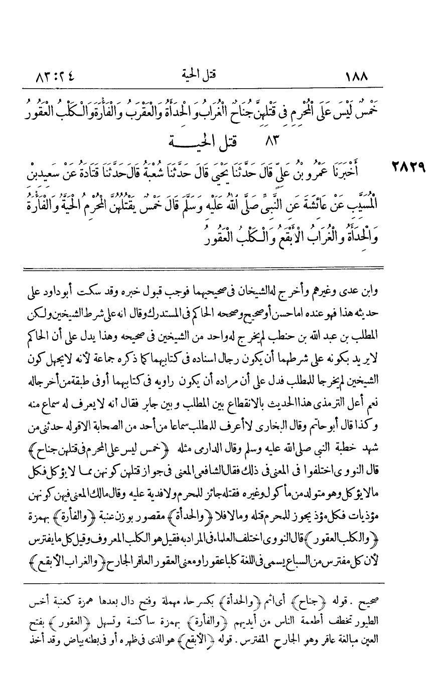 [2828] خَمْسٌ لَيْسَ عَلَى الْمُحْرِمِ فِي قَتْلِهِنَّ جُنَاحٌ قَالَ النَّوَوِيُّ اخْتَلَفُوا فِي الْمَعْنَى فِي ذَلِكَ فَقَالَ الشَّافِعِيُّ الْمَعْنَى فِي جَوَازِ قَتْلِهِنَّ كَوْنُهُنَّ مِمَّا لَا يُؤْكَل فَكل مَالا يُؤْكَلُ وَهُوَ مُتَوَلِّدٌ مِنْ مَأْكُولٍ وَغَيْرِهِ فَقَتْلُهُ جَائِزٌ لِلْمُحْرِمِ وَلَا فِدْيَةَ عَلَيْهِ وَقَالَ مَالِكٌ الْمَعْنَى فِيهِنَّ كَوْنُهُنَّ مُؤْذِيَاتٍ فَكُلُّ مُؤْذٍ يَجُوزُ للْمحرمِ قَتله ومالا فَلَا وَالْحِدَأَةُ مَقْصُورٌ بِوَزْنِ عِنَبَةٍ وَالْفَأْرَةُ بِهَمْزَةٍ وَالْكَلْبُ الْعَقُورُ قَالَ النَّوَوِيُّ اخْتَلَفَ الْعُلَمَاءُ فِي الْمُرَادِ بِهِ فَقِيلَ هُوَ الْكَلْبُ الْمَعْرُوفُ وَقِيلَ كُلُّ مَا يَفْتَرِسُ لِأَنَّ كُلَّ مُفْتَرِسٍ مِنَ السِّبَاعِ يُسَمَّى فِي اللُّغَةِ كَلْبًا عَقُورًا وَمَعْنَى الْعَقُور العاقر الْجَارِح