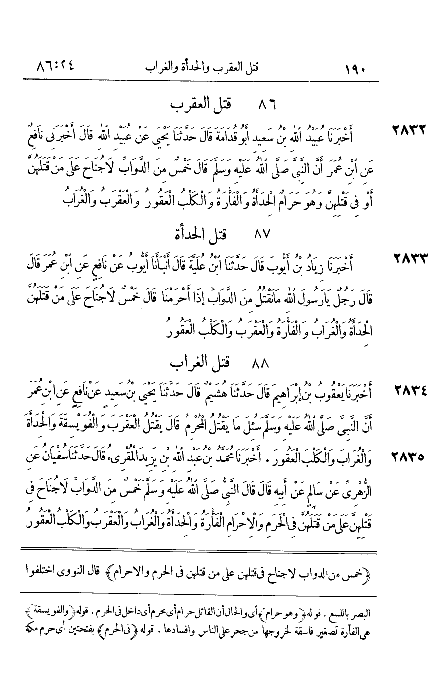 [2835] خَمْسٌ مِنَ الدَّوَابِّ لَا جُنَاحَ فِي قَتْلِهِنَّ عَلَى مَنْ قَتَلَهُنَّ فِي الْحَرَمِ وَالْإِحْرَامِ قَالَ النَّوَوِيُّ اخْتَلَفُوا فِي ضَبْطِ الْحَرَمِ هُنَا فَضَبَطَهُ جَمَاعَةٌ مِنَ الْمُحَدِّثِينَ بِفَتْحِ الْحَاءِ وَالرَّاءِ الْحَرَمُ الْمَشْهُورُ وَهُوَ حَرَمُ مَكَّةَ وَالثَّانِي بِضَمِّ الْحَاءِ وَالرَّاءِ وَلَمْ يَذْكُرِ الْقَاضِي عِيَاضٌ فِي الْمَشَارِقِ غَيْرَهُ قَالَ هُوَ جَمْعُ حَرَامٍ كَمَا قَالَ تَعَالَى وَأَنْتُم حرم قَالَ وَالْمُرَادُ بِهِ الْمَوَاضِعُ الْمُحَرَّمَةُ قَالَ النَّوَوِيُّ وَالْفَتْح أظهر مِنْ وَثْءٍ بِفَتْحِ الْوَاوِ وَسُكُونِ الْمُثَلَّثَةِ هُوَ وَهَنٌ فِي الرِّجْلِ دُونَ الْخَلْعِ وَالْكَسْرِ يُقَالُ وَثِئَتْ رِجْلُهُ فَهِيَ مَوْثُوءَةٌ وَوَثَأْتُهَا أَنَا وَقَدْ تتْرك الْهمزَة