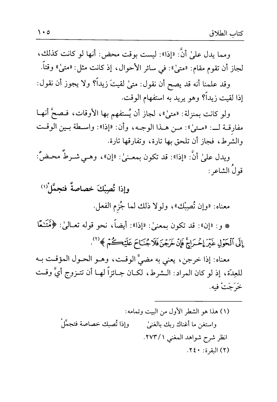 * و: "إن": قد تكون بمعنى: "إذا": أيضًا، نحو قوله تعالى: {متاعًا إلى الحول غير إخراج فإن خرجن فلا جناح عليكم}.
