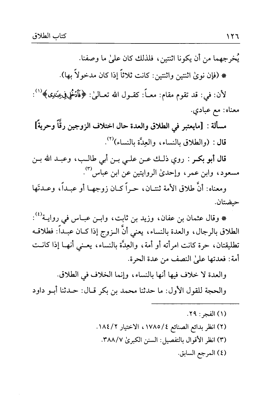 * وقال عثمان بن عفان، وزيد بن ثابت، وابن عباس في رواية: الطلاق بالرجال، والعدة بالنساء، يعني أن الزوج إذا كان عبدًا: فطلاقه تطليقتان، حرة كانت امرأته أو أمة، والعدة بالنساء، يعني أنها إذا كانت أمة: فعدتها على النصف من عدة الحرة.