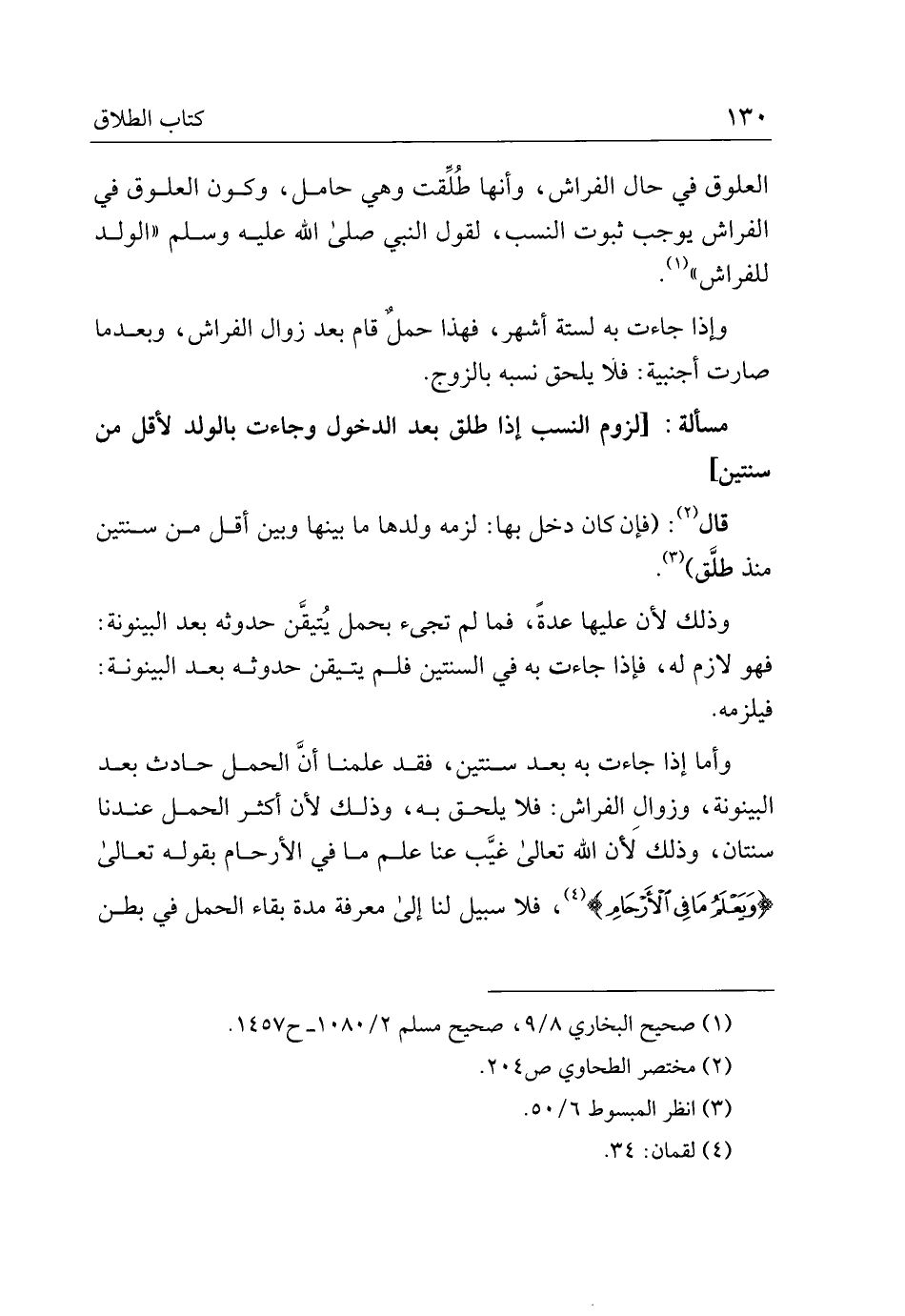 وأما إذا جاءت به بعد سنتين، فقد علمنا أن الحمل حادث بعد البينونة، وزوال الفراش: فلا يلحق به، وذلك لأن أكثر الحمل عندنا سنتان، وذلك لأن الله تعالى غيب عنا علم ما في الأرحام بقوله تعالى {ويعلم ما في الأرحام}، فلا سبيل لنا إلى معرفة مدة بقاء الحمل في بطن