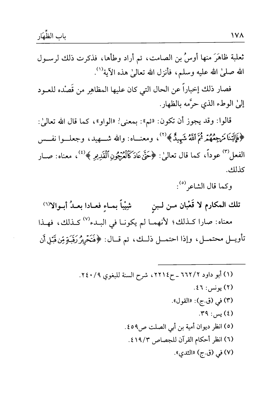 قالوا: وقد يجوز أن تكون: "ثم": بمعنى: "الواو"، كما قال الله تعالى: {فإلينا مرجعهم ثم الله شهيد}، ومعناه: والله شهيد، وجعلوا نفس الفعل عودًا، كما قال تعالى: {حتى عاد كالعرجون القديم}، معناه: صار كذلك.