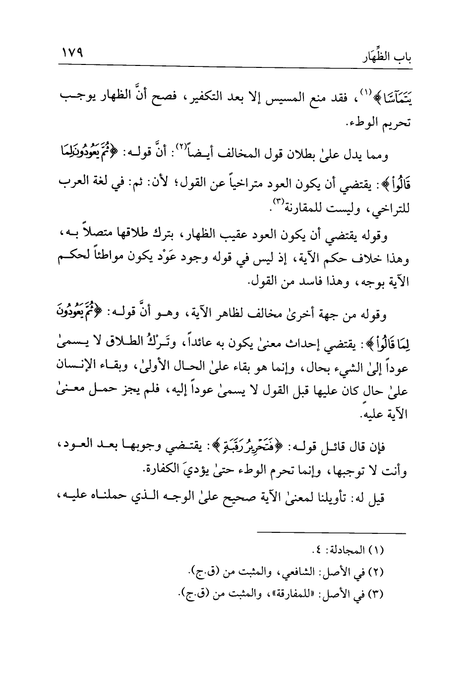 ومما يدل على بطلان قول المخالف أيضًا: أن قوله: {ثم يعودون لما قالوا}: يقتضي أن يكون العود متراخيًا عن القول؛ لأن: ثم: في لغة العرب للتراخي، وليست للمقارنة.