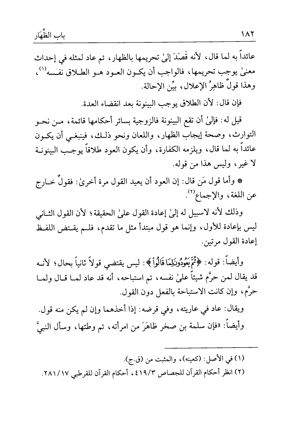 عائدًا به لما قال، لأنه قصد إلى تحريمها بالظهار، ثم عاد لمثله في إحداث معنى يوجب تحريمها، فالواجب أن يكون العود هو الطلاق نفسه، وهذا قول ظاهر الإعلال، بين الإحالة.