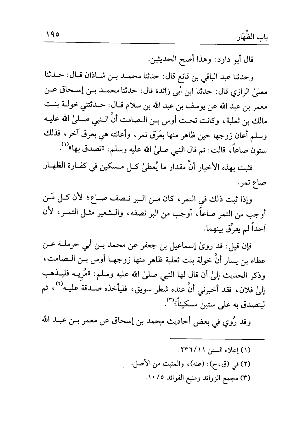 وحدثنا عبد الباقي بن قانع قال: حدثنا محمد بن شاذان قال: حدثنا معلى الرازي قال: حدثنا ابن أبي زائدة قال: حدثنا محمد بن إسحاق عن معمر بن عبد الله عن يوسف بن عبد الله بن سلام قال: حدثتني خولة بنت مالك بن ثعلبة، وكانت تحت أوس بن الصامت أن النبي صلى الله عليه وسلم أعان زوجها حين ظاهر منها بعرق تمر، وأعانته هي بعرق آخر، فذلك ستون صاعًا، قالت: ثم قال النبي صلى الله عليه وسلم: "تصدق بها".